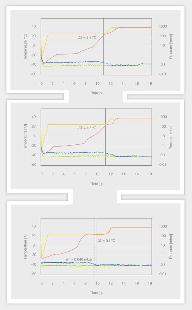 上圖所示為壓差為 0.05 mbar 的結(jié)果,中間圖為 0.03 mbar,底圖為 0.025 mbar 作為終點標(biāo)準(zhǔn)。在達到終點標(biāo)準(zhǔn)之前,壓差至少保持 60 分鐘。隔板溫度用黃線表示,樣品溫度用紅線表示,干燥箱壓力用綠線表示,皮拉尼壓力計在初級干燥(白色陰影)和二級干燥(灰色陰影)上用藍線表示。同時顯示達到壓力(黑線)和溫度終點標(biāo)準(zhǔn)(黑色虛線)的時間,以及該點相應(yīng)的溫度和壓力差。