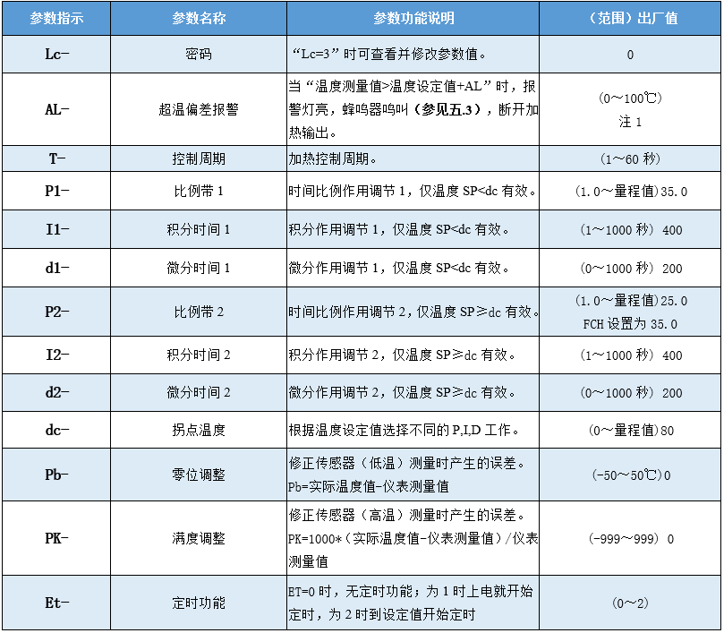 再點(diǎn)擊設(shè)定鍵,若密碼值不正確,控制器自動(dòng)返回到正常顯示狀態(tài),若密碼值正確,則進(jìn)入到溫度內(nèi)部參數(shù)設(shè)定狀態(tài),再點(diǎn)擊設(shè)定鍵可以依次修改各個(gè)參數(shù)。